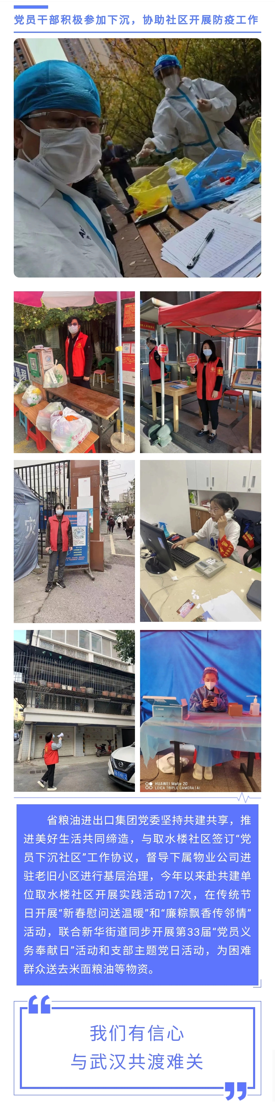 由于本土疫情呈現(xiàn)嚴(yán)峻復(fù)雜趨勢(shì),省糧油進(jìn)出口集團(tuán)嚴(yán)格貫徹落實(shí)湖北農(nóng)發(fā)集團(tuán)黨委部署要求,踐行國(guó)企擔(dān)當(dāng),組織黨員協(xié)助對(duì)口社區(qū)做好消殺工作,并積極號(hào)召組織黨員在嚴(yán)格采取防護(hù)措施前提下,積極支援各居住地社區(qū)疫情防控,協(xié)助小區(qū)防控值守、辦理通行證、核酸檢測(cè)等工作,守護(hù)“疫”線“菜籃子”“米袋子”,切實(shí)筑牢安全生產(chǎn)與疫情防控“雙防線”。截至日前,黨員下沉社區(qū)開(kāi)展工作共572人次,共計(jì)1946.5小時(shí)。
