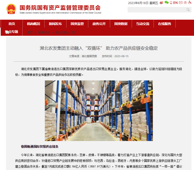 國(guó)務(wù)院國(guó)資委:湖北農(nóng)發(fā)集團(tuán)主動(dòng)融入“雙循環(huán)” 助力農(nóng)產(chǎn)品供應(yīng)鏈安全穩(wěn)定