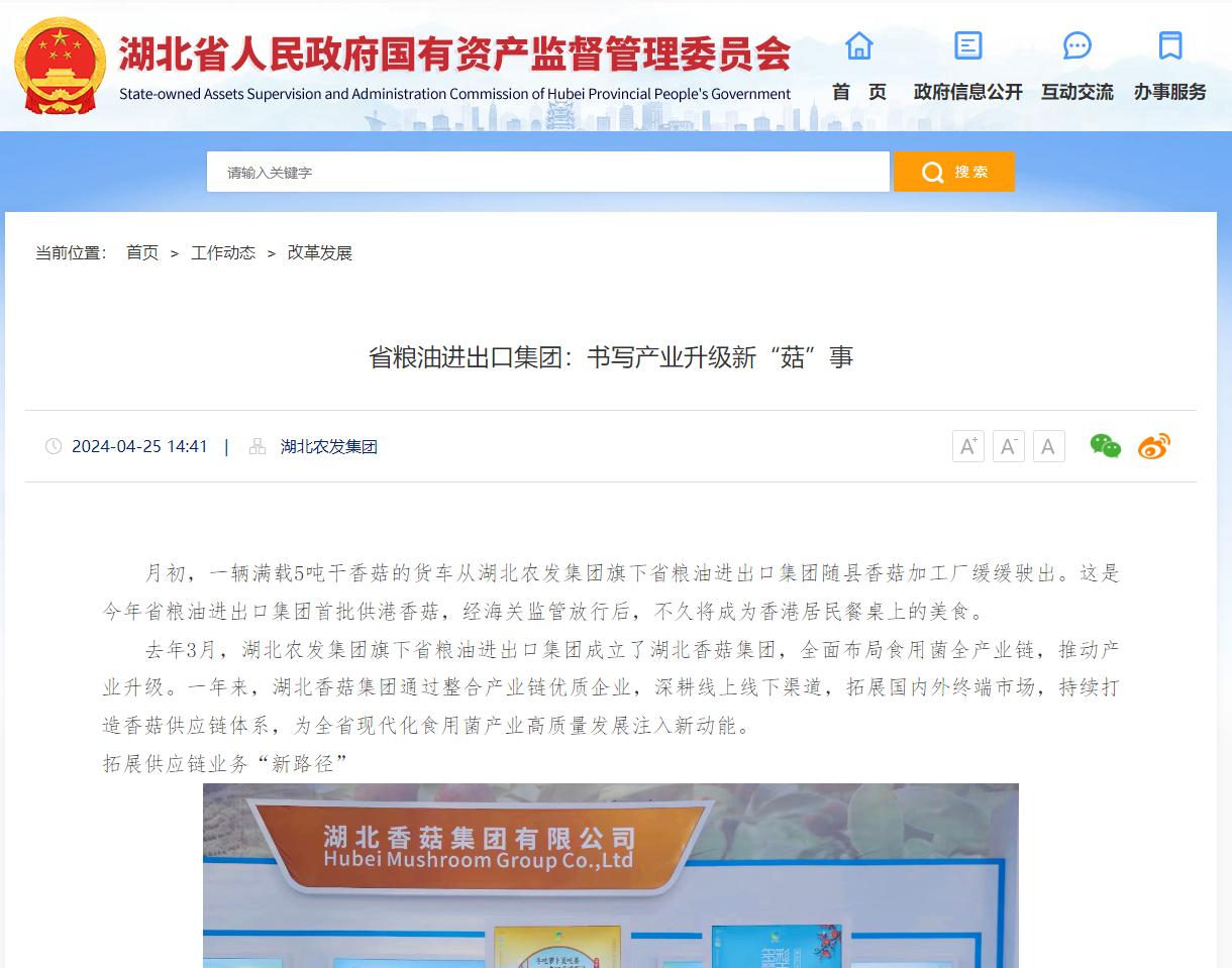 湖北省國資委:省糧油進出口集團書寫產業升級新“菇”事