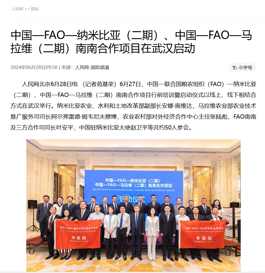人民網(wǎng):中國—FAO—納米比亞(二期)、中國—FAO—馬拉維(二期)南南合作項目在武漢啟動