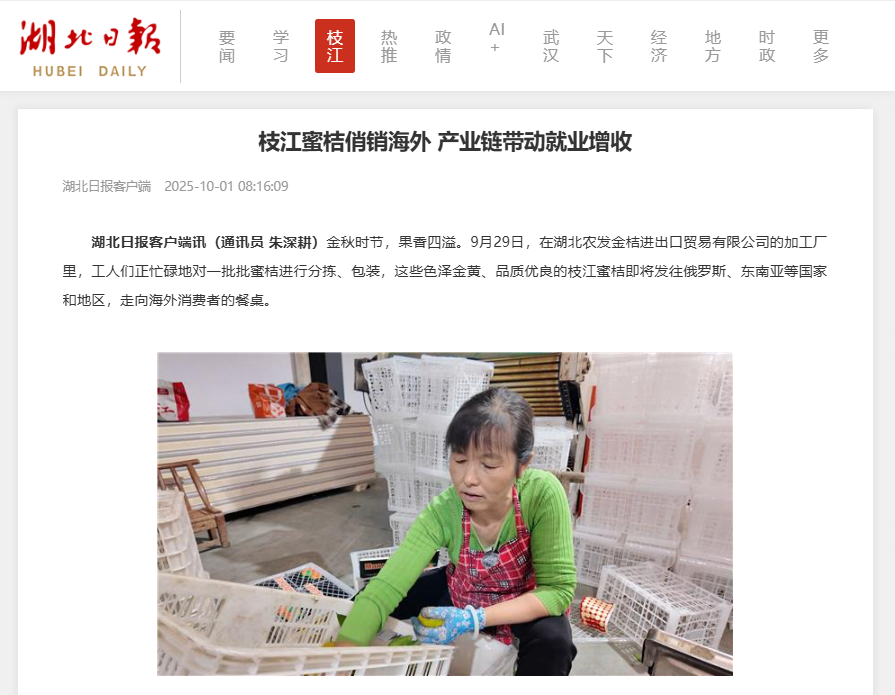 湖北日報:枝江蜜桔俏銷海外 產業鏈帶動就業增收